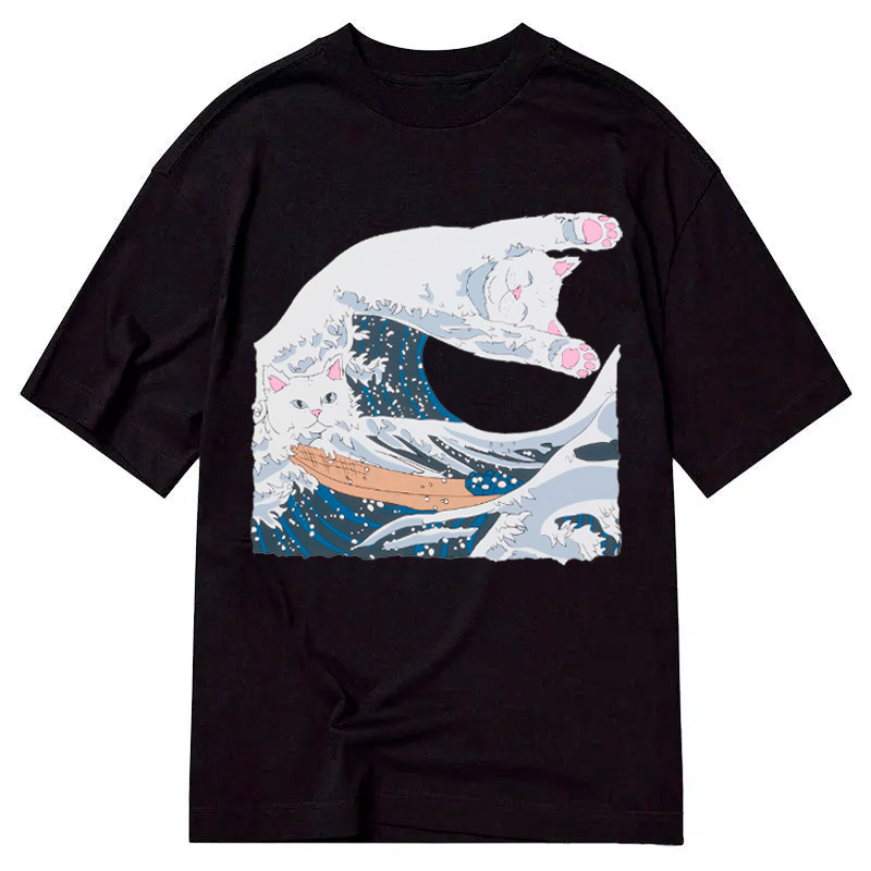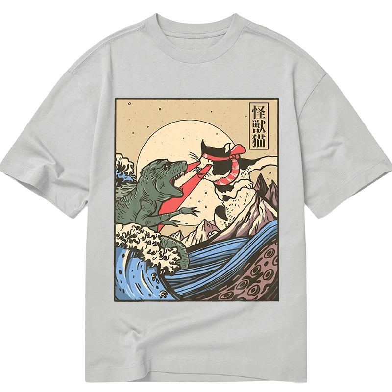 Vintage Retro Japanese Great Wave Cat VS Monster Classic T-Shirt For Sale