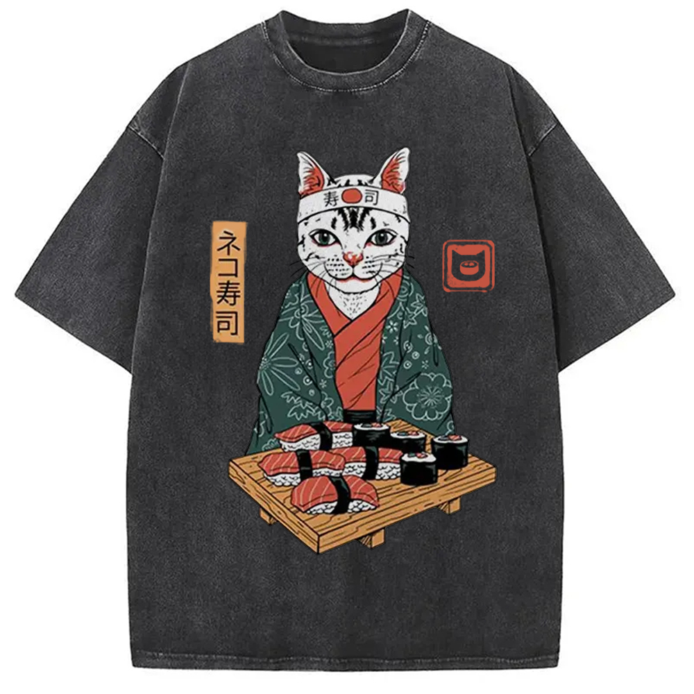 Neko Sushi Japan Culture Creative Washed T-Shirt