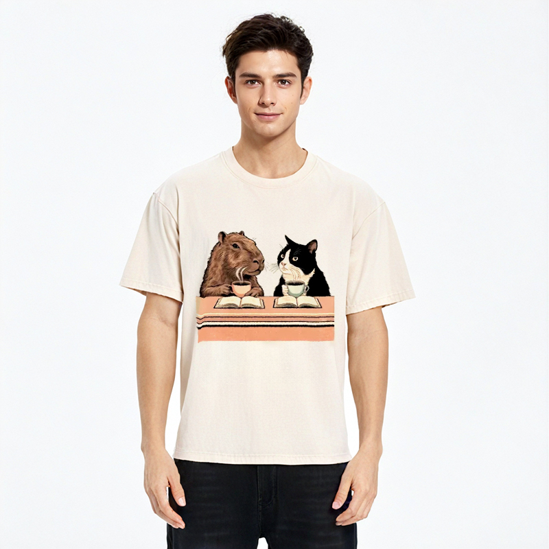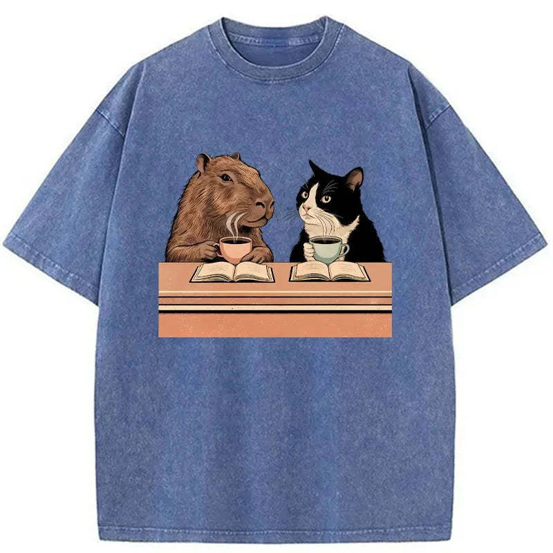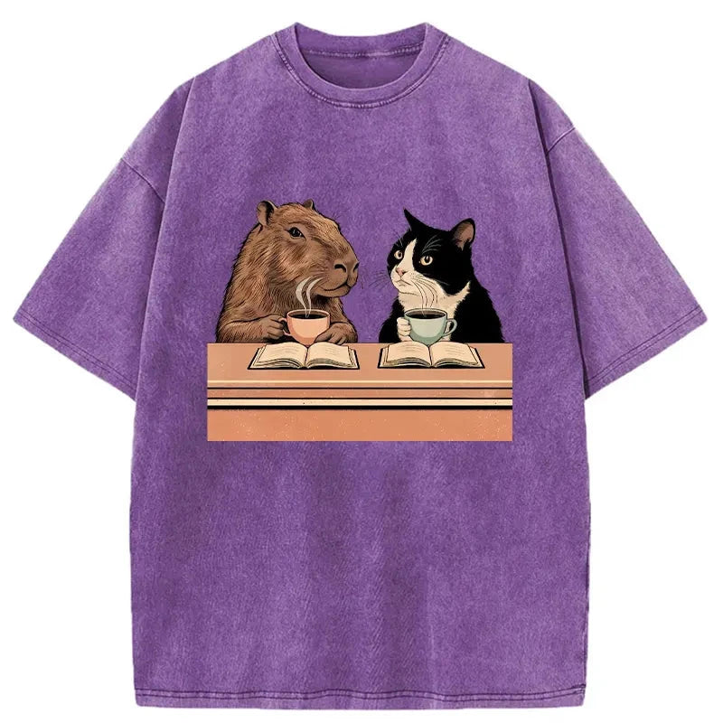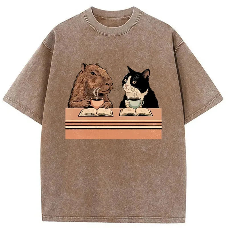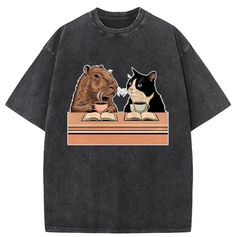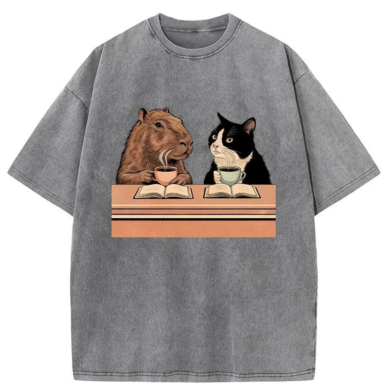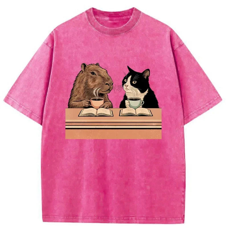 Capybara And Cat Talk Washed T-Shirt For Sale