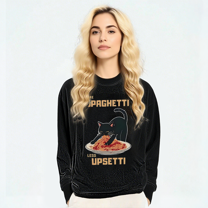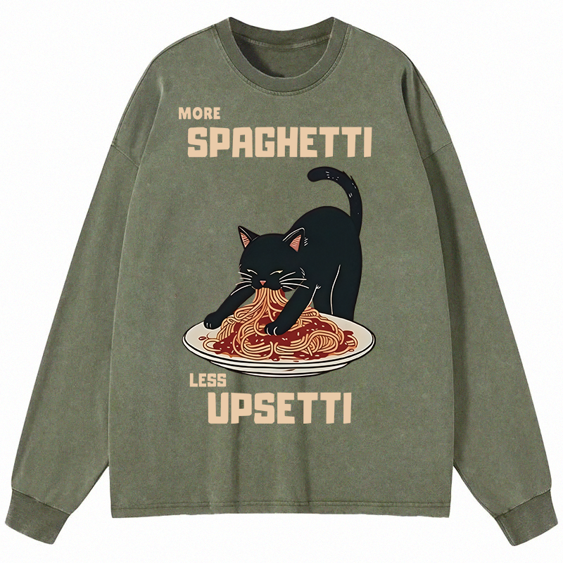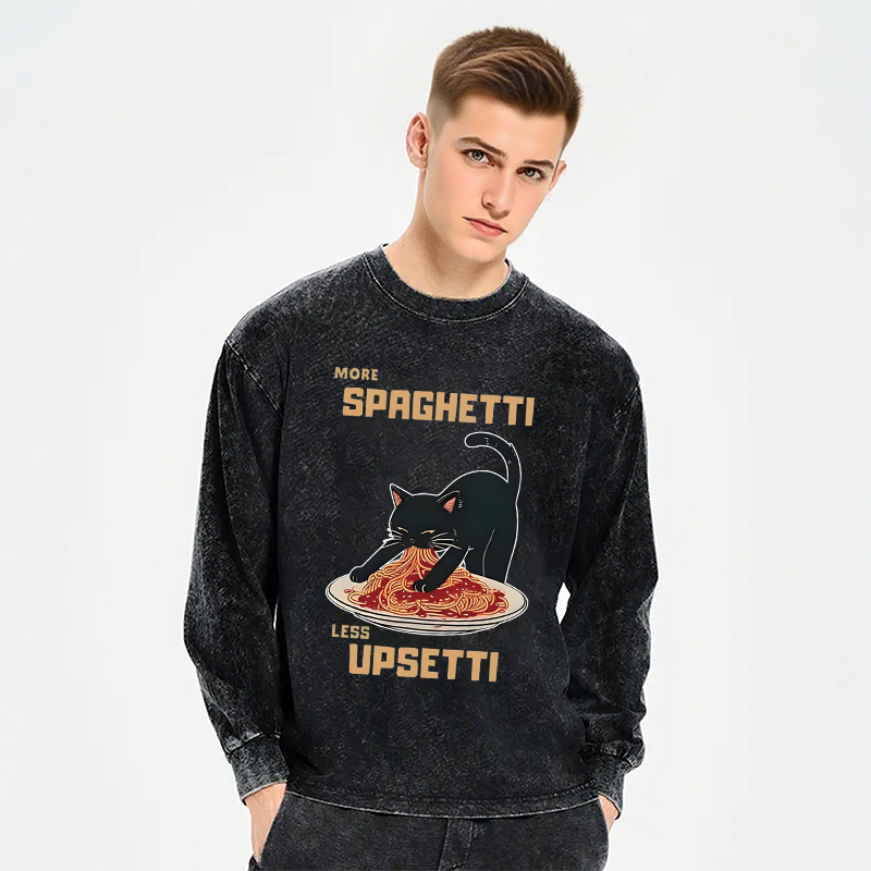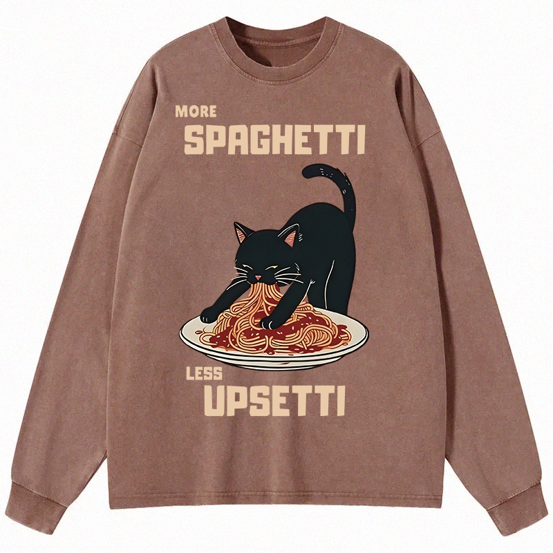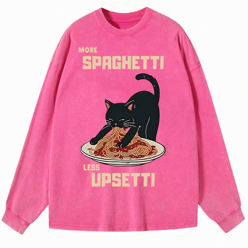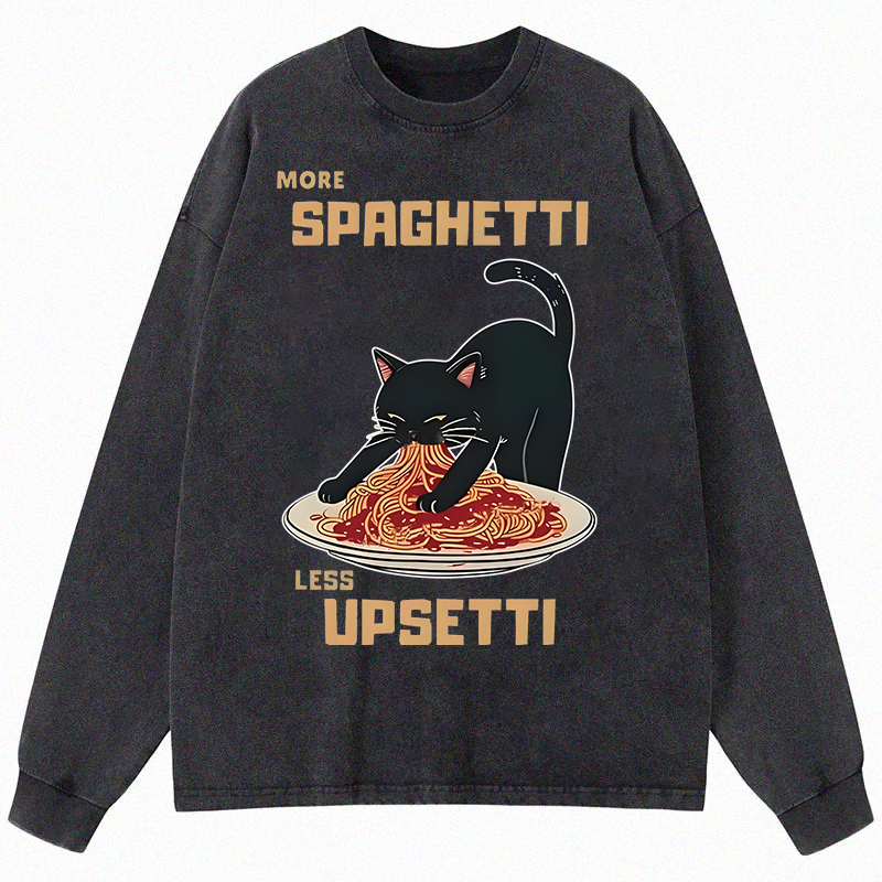 Cat Eating Spaghetti Funny Long Sleeve Washed T-Shirt