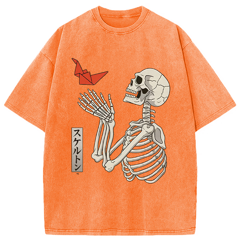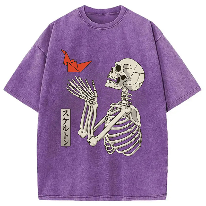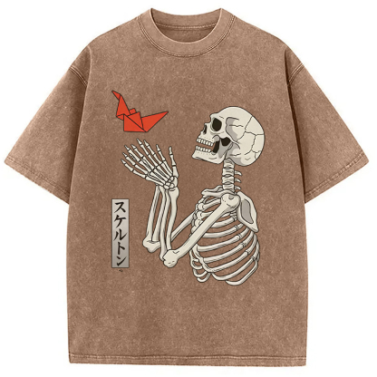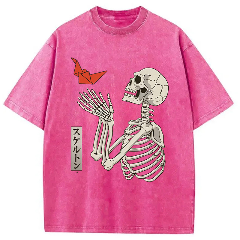 Flying Paper Cranes Japanese Skeleton Washed T-Shirt