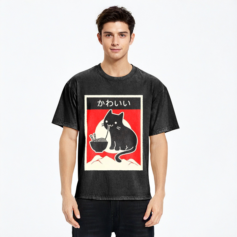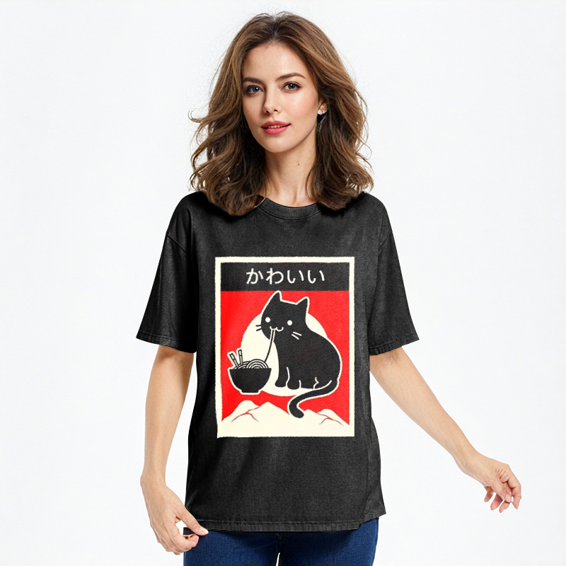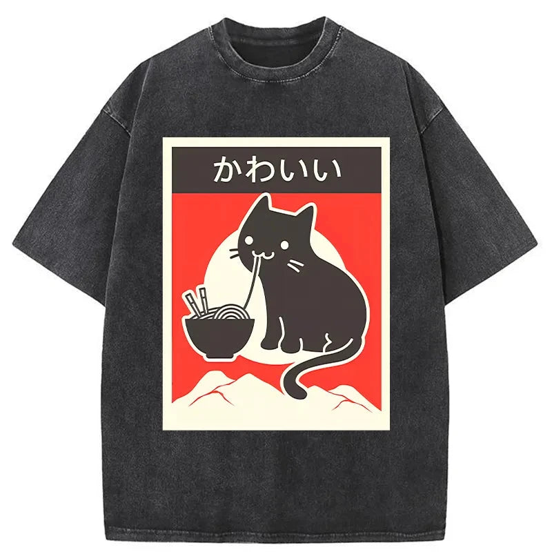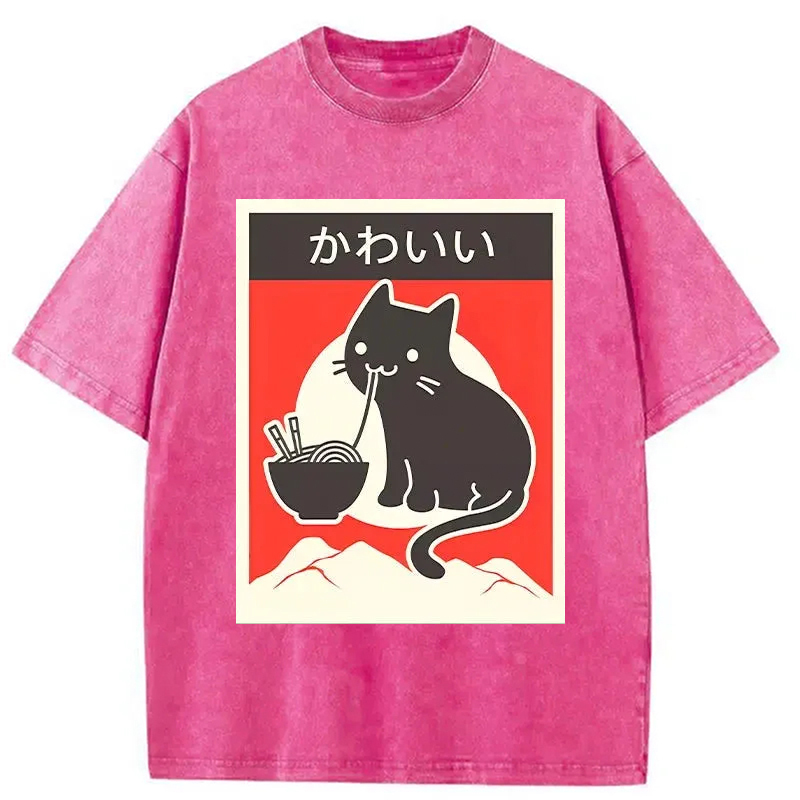 Kawaii Vintage Ramen Cat Washed T-Shirt For Sale