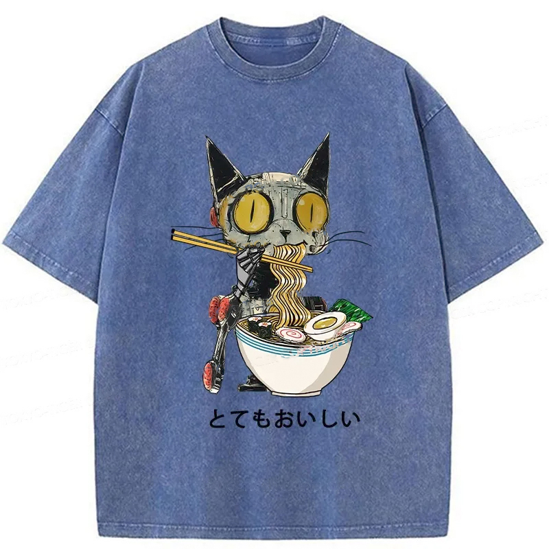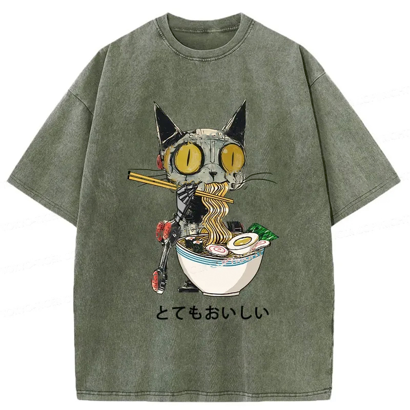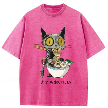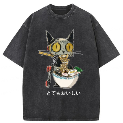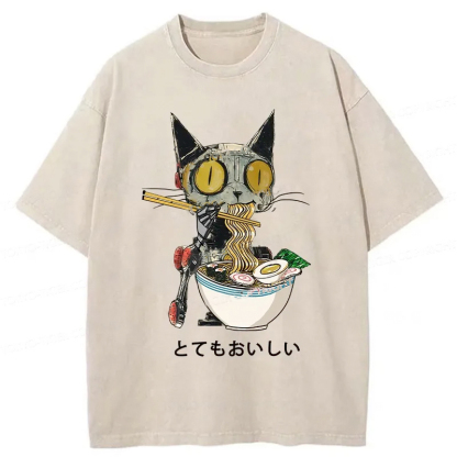 Ramen Lover Robot Cat Washed T-Shirt