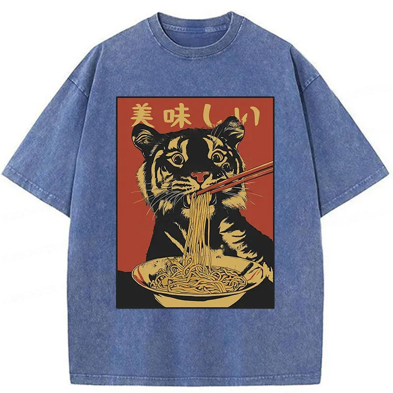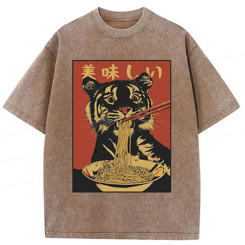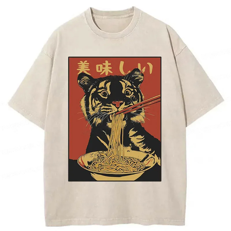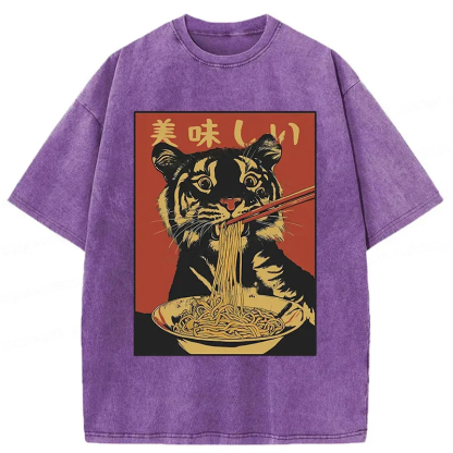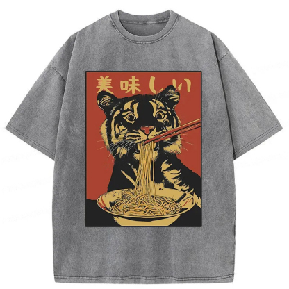 Tiger Eating Delicious Ramen Washed T-Shirt