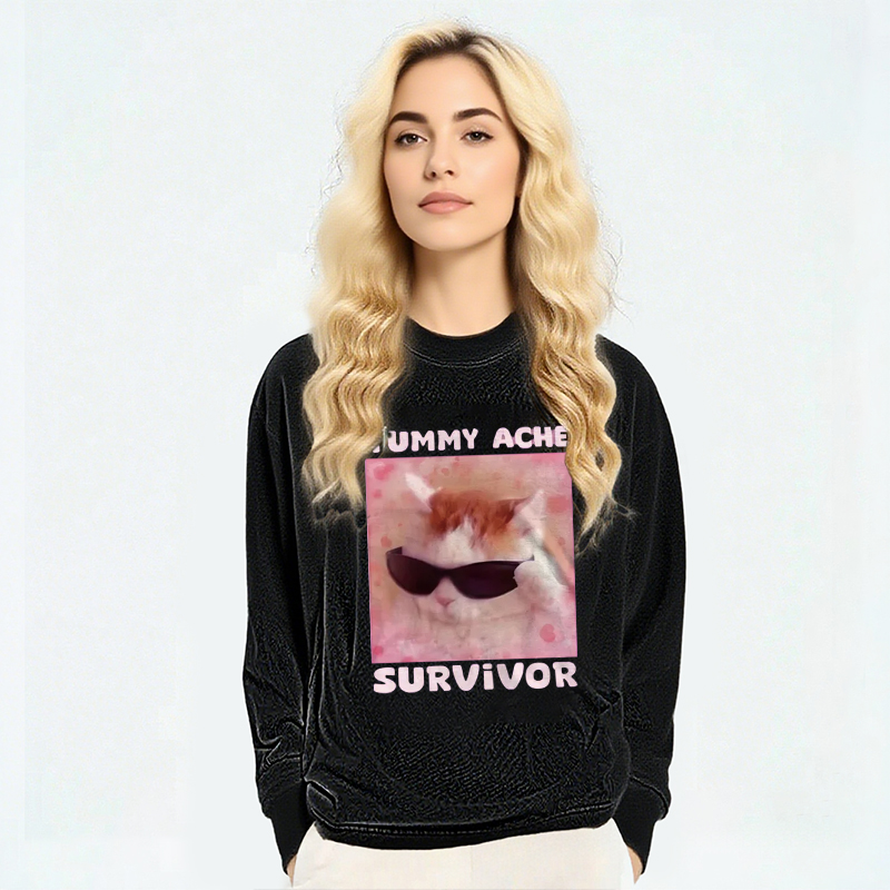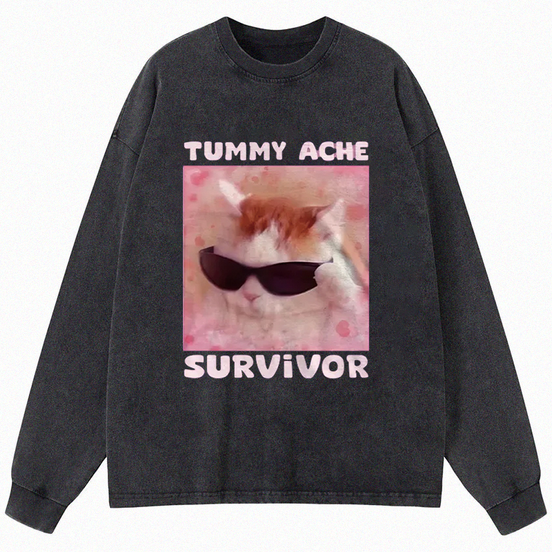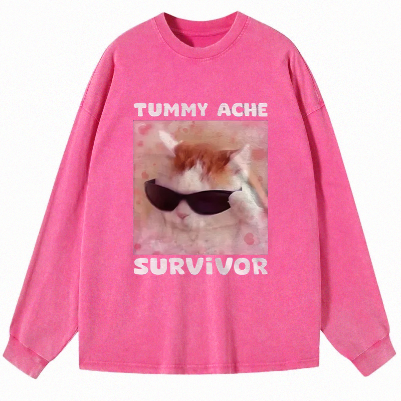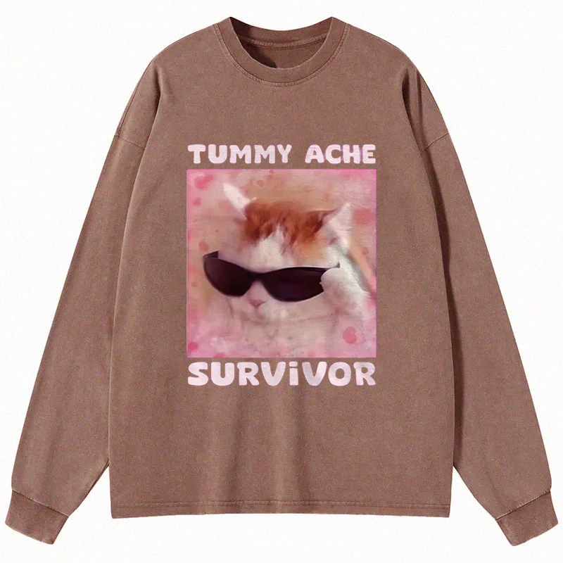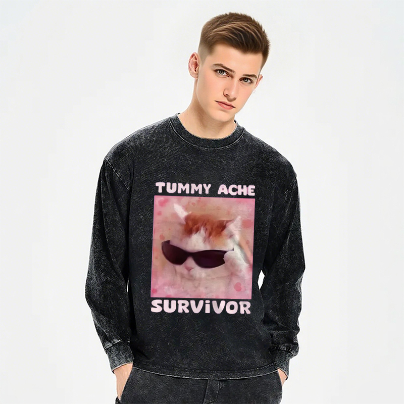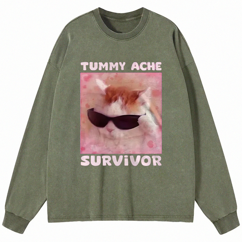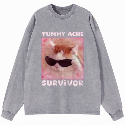 Tummy Ache Survivor Funny Cat Meme Long Sleeve Washed T-Sh
