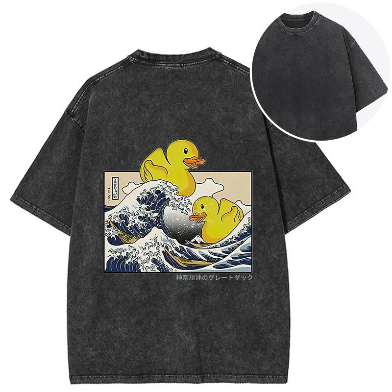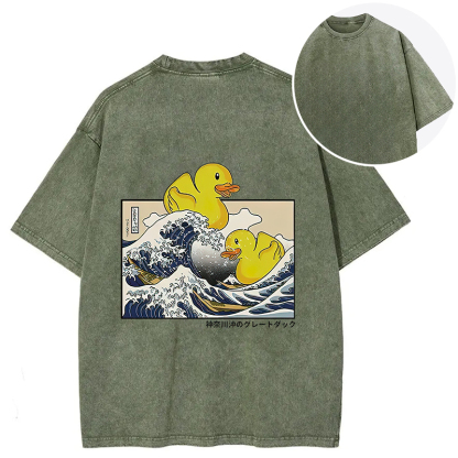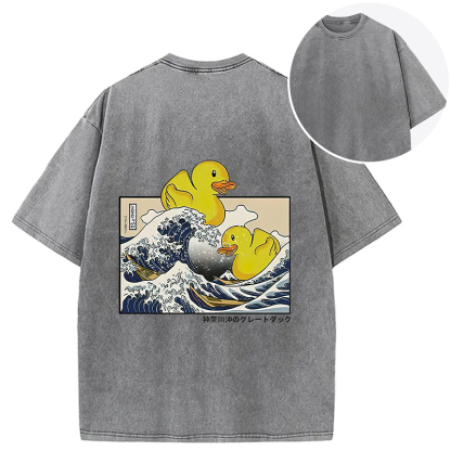 Ukiyoe Waves And Cute Yellow Duck Back Washed T-Shirt