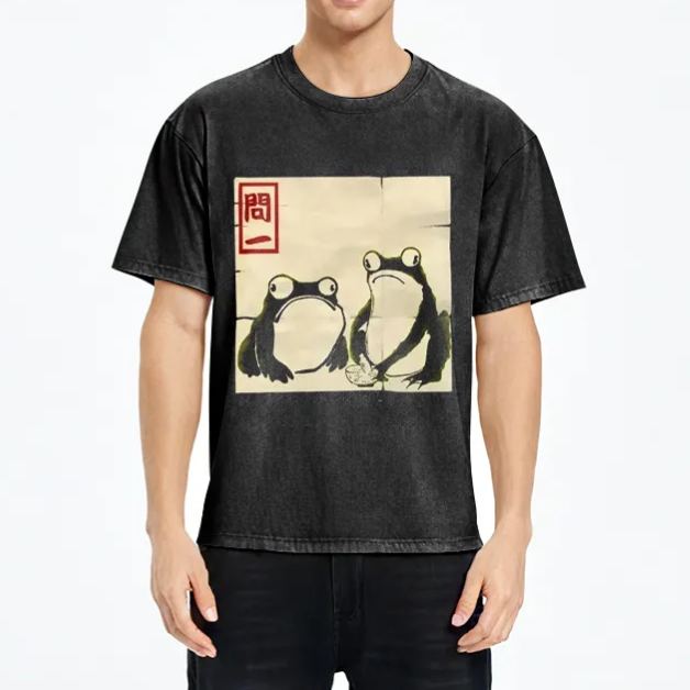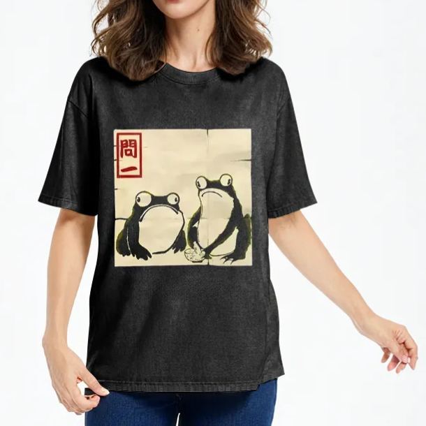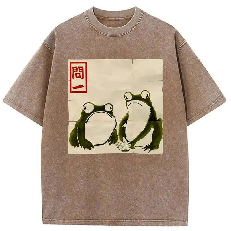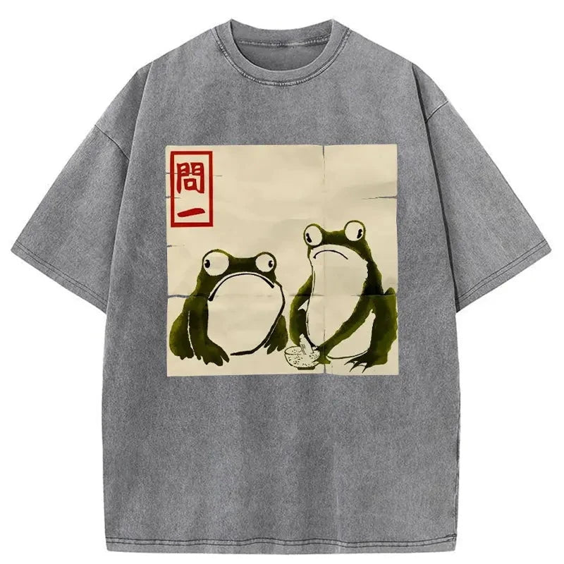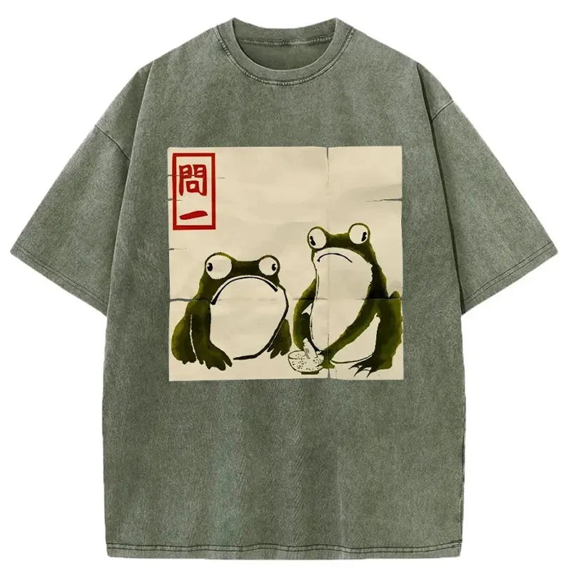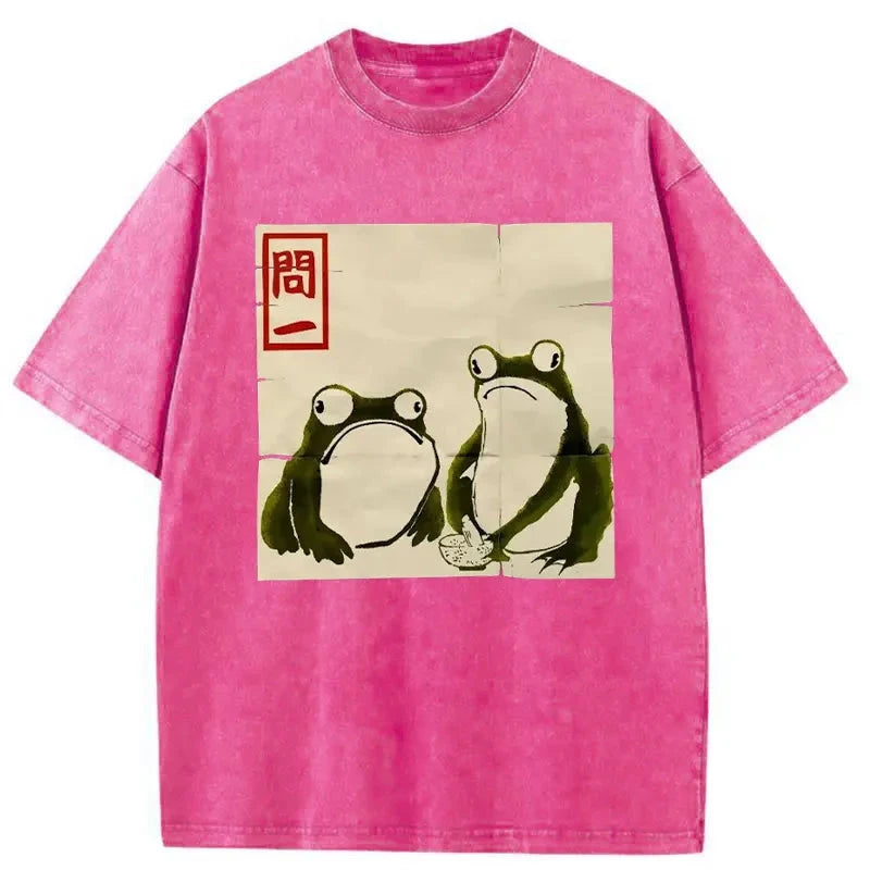 Woodblock Print Grumpy Frog Japan Washed T-Shirt